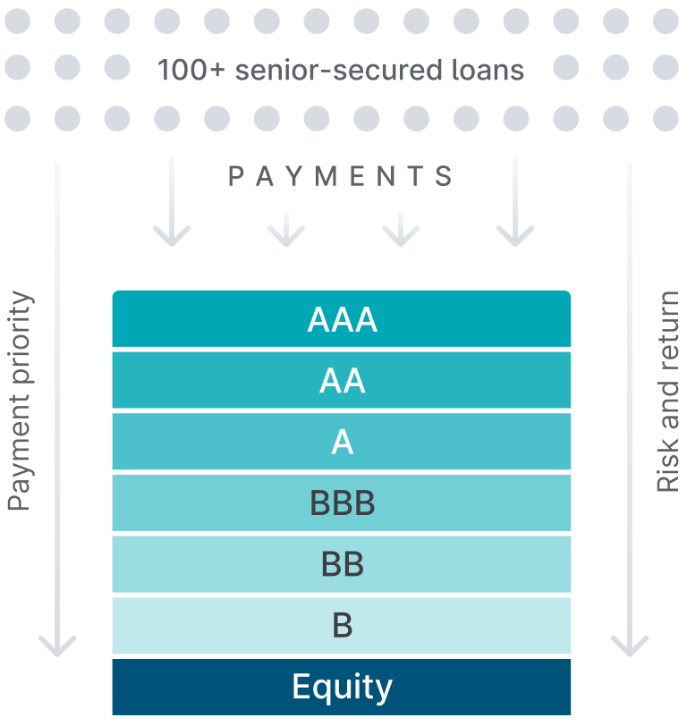 The debt portion of the CLO is organized into multiple levels, known as tranches, that investors can select from. A final equity tranche sits at the bottom.